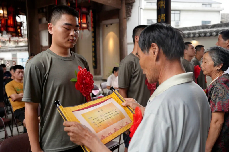 蔡宅村则以“孝之路”为主线,精心打造家风教育场景。漫步古街,两侧整齐排列的家训旗杆格外引人注目,每一根旗杆都写着不同字体的“孝”字,成为流动的文化课堂。在2024年村里举办的“带着家训去参军”的活动现场,新兵刘星吉从父亲手中接过一笔一划书写的家训,郑重地与入伍通知书一同收进行囊。“家训不仅是我军旅生涯的精神寄托,更是指引我未来工作和生活的明灯。” 多年来,已有数十名青年带着家风嘱托踏上军旅之路,让优良家风在新时代绽放光彩。