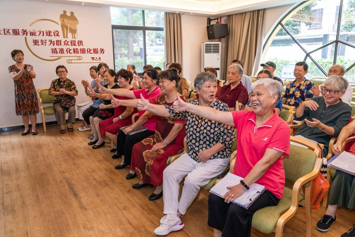 8月31日,浙江省台州市临海市鹿城社区的居民们正在社区温暖之家排练社区之歌《全心全意》。新华网 钟奕 摄