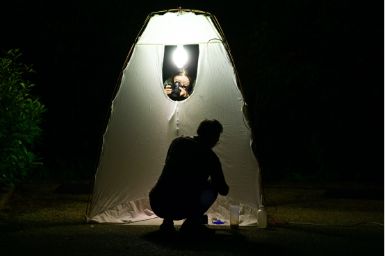 2024年9月9日,张超、张芯语在进行蛾类采集、拍照工作。新华网发(重庆市江津区融媒体中心 苏盛宇 摄)