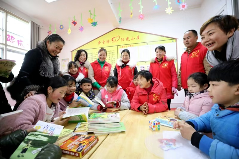 甘公荣带领“龚全珍志愿者协会”志愿者和杨枧小学学生在一起。莲花县龚全珍志愿协会供图